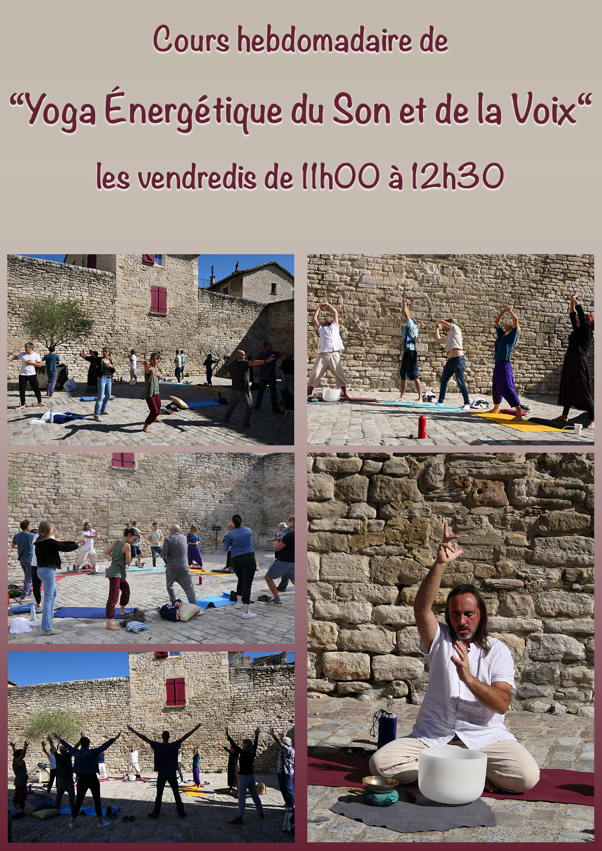 Mouvements, postures et assouplissements énergétiques, associés aux Chant Sacré des “Sons Sources » : Voyelles et Bijas Mantras, Chant intuitif, Chant de l’âme.
