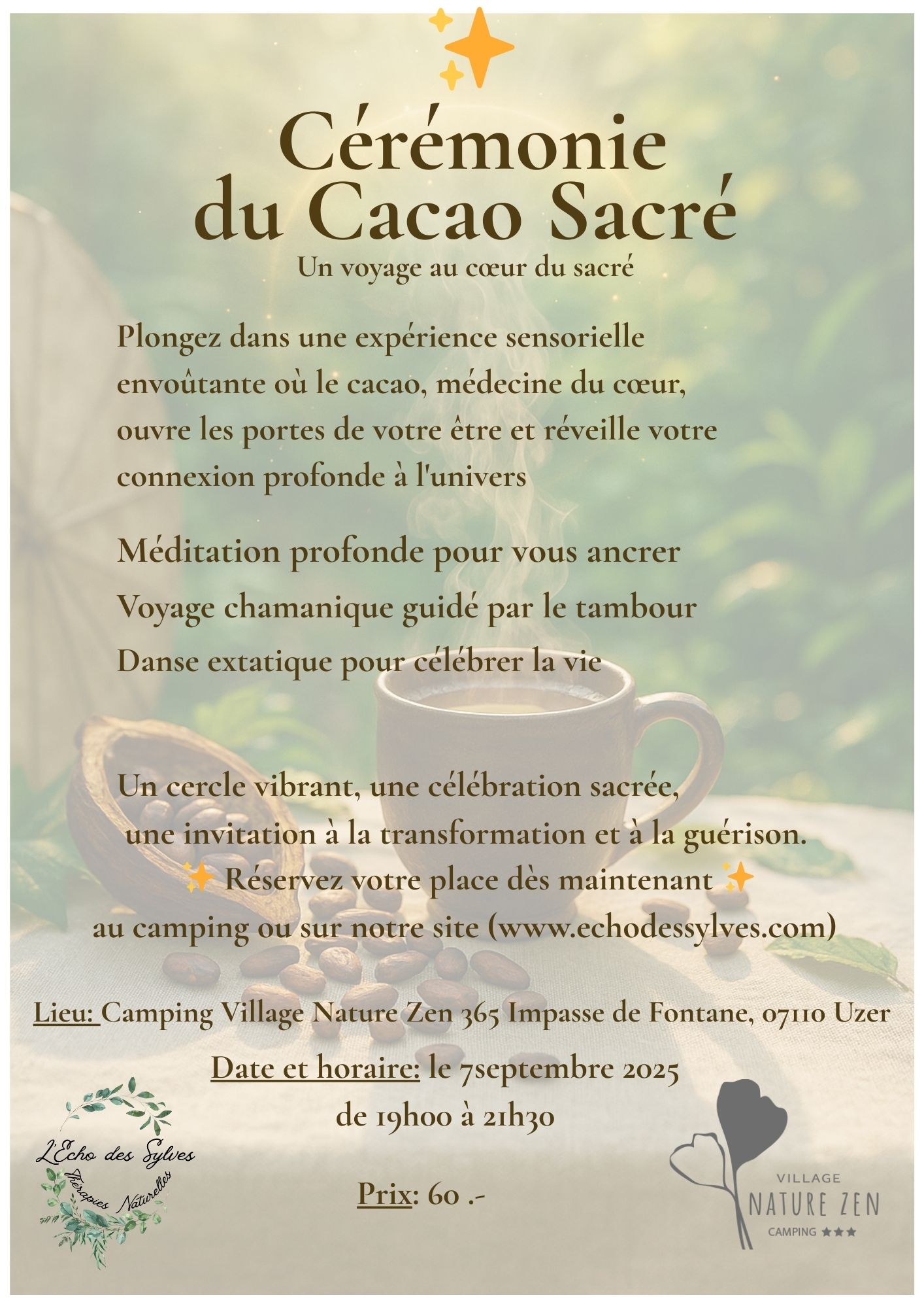 Plongez dans une expérience sensorielle envoûtante où le cacao, médecine du cœur, ouvre les portes de votre être et réveille votre connexion profonde à l’univers
