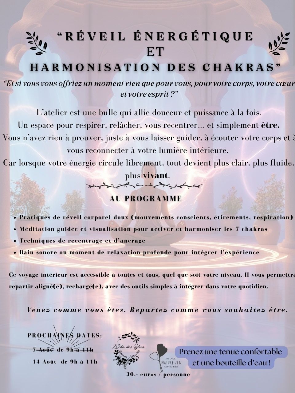 Ce voyage intérieur est aecessible à toutes et tous, quel que soit votre niveau. Il vous permettr: repartir aligné(e), rechargé(e), avec des outils simples à intégrer dans votre quotidien.