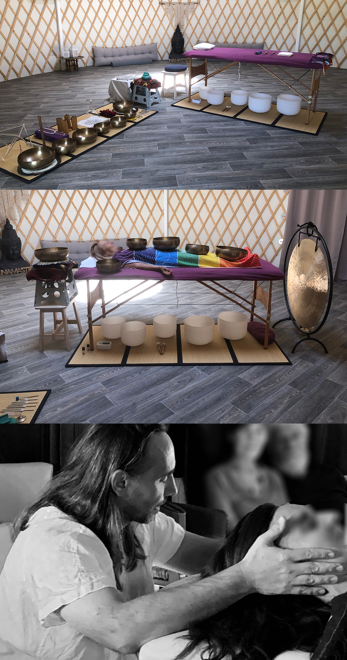 séance de soin individuel holistique (énergétique et vibratoire) /  Massage Sonore en profondeur à l’aide d’instruments intuitifs et vibratoires, et de l’énergétique de la voix.