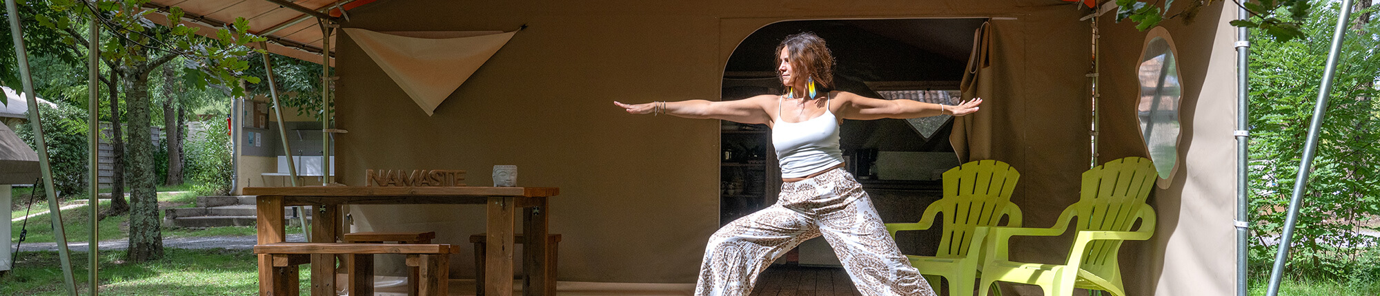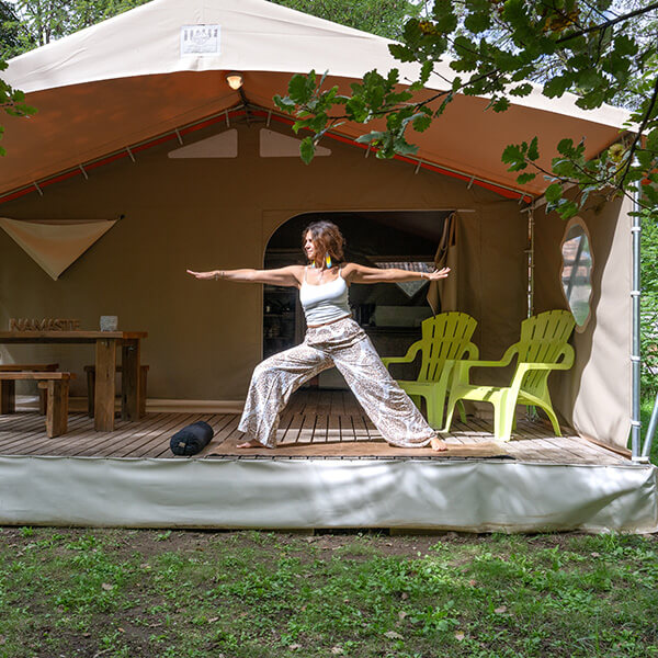 Les tentes Canada proposent un espace de vie spacieux de 20 m² avec une grande terrasse couverte de 14 m² permettant de prendre ses repas à l’extérieur par tout temps avec vue sur la rivière.