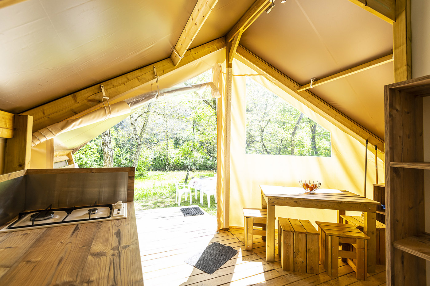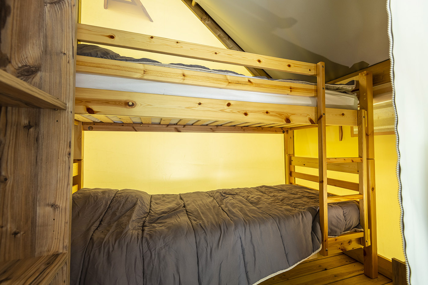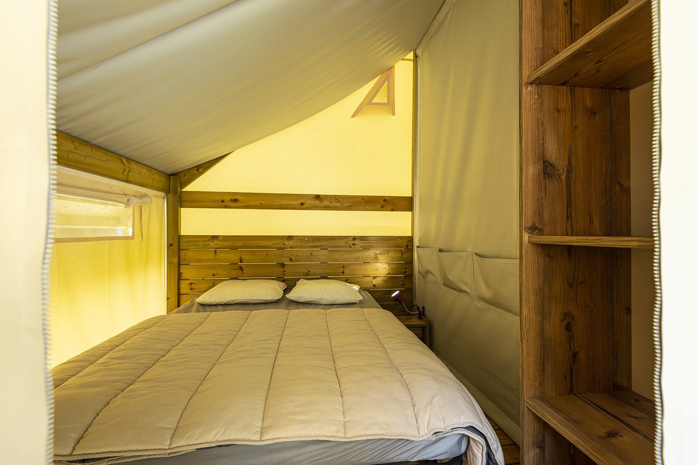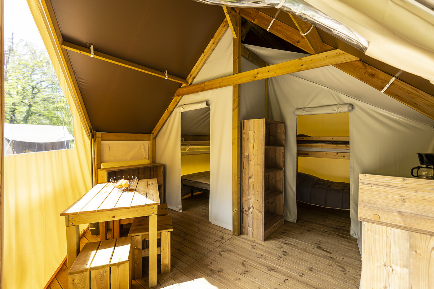 De Ecolodge-tenten zijn zeer cosy en hebben een atypische vorm: ze hebben een structuur uit hout en uit doek en het interieurmeubilair is volledig uit hout gemaakt.