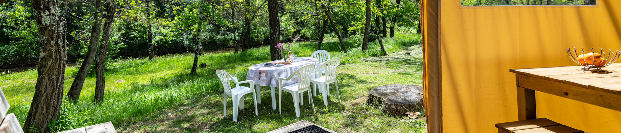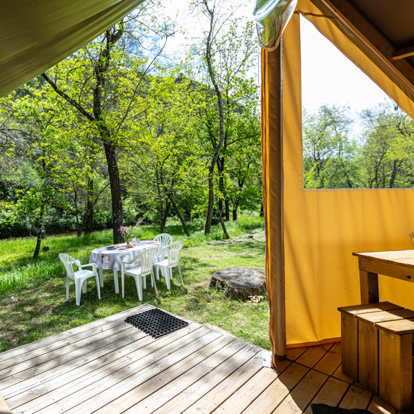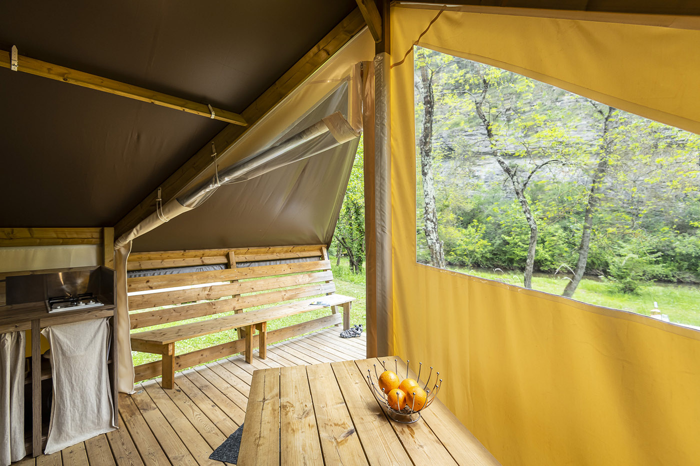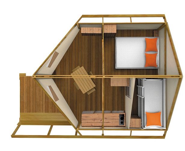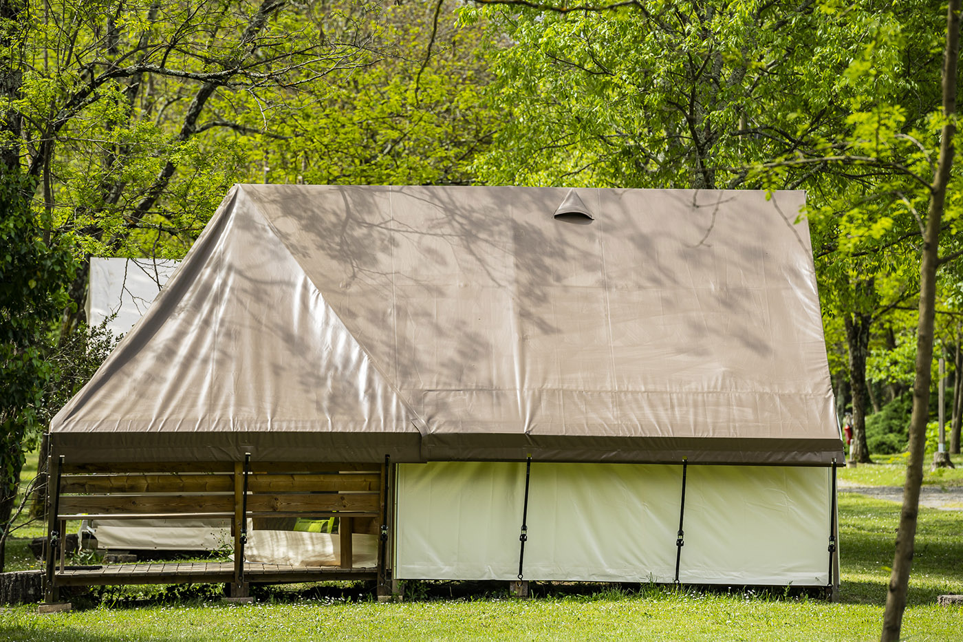 De Ecolodge-tenten zijn zeer cosy en hebben een atypische vorm: ze hebben een structuur uit hout en uit doek en het interieurmeubilair is volledig uit hout gemaakt.